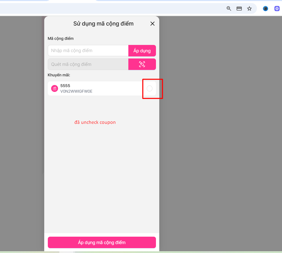 uncheck coupon rồi click áp dụng => sẽ có một pop-up không đúng
