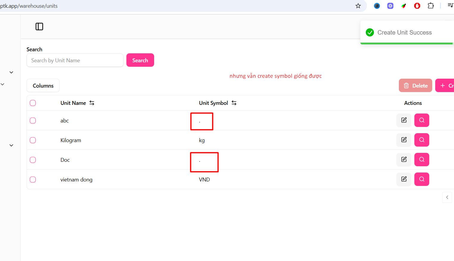 - Cả phần unit name cũng không validate ký tự đặc biệt nên cần check lại cả all system những fields cần unique
