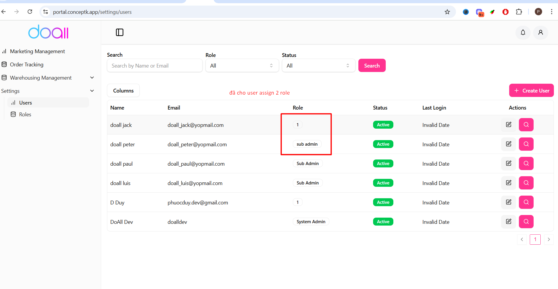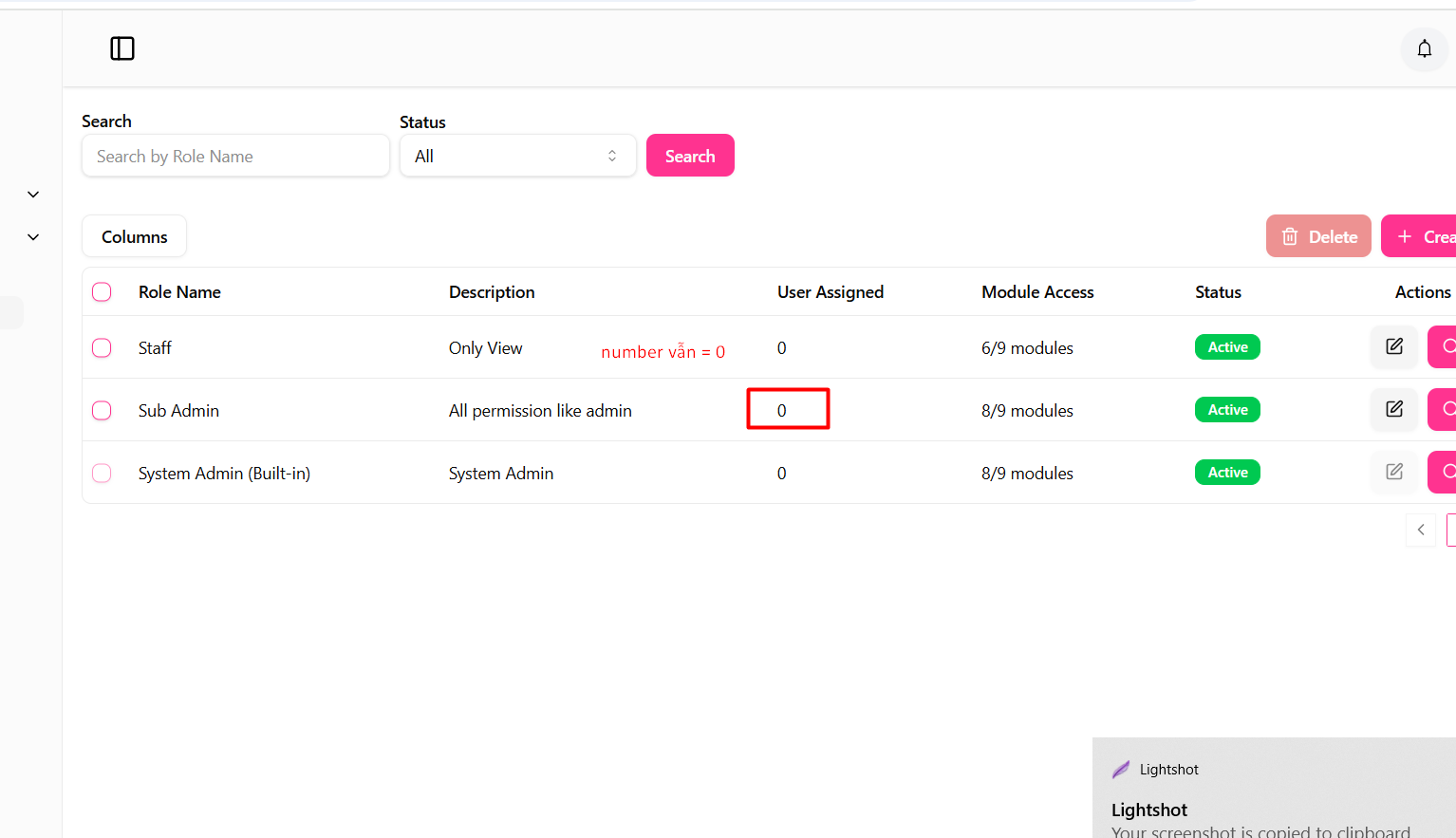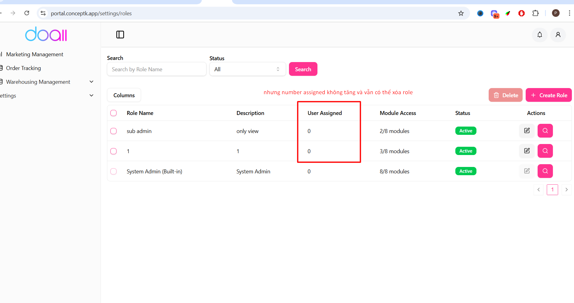 phần user assigned số lượng không tăng và role đã assigned vẫn có thể xóa